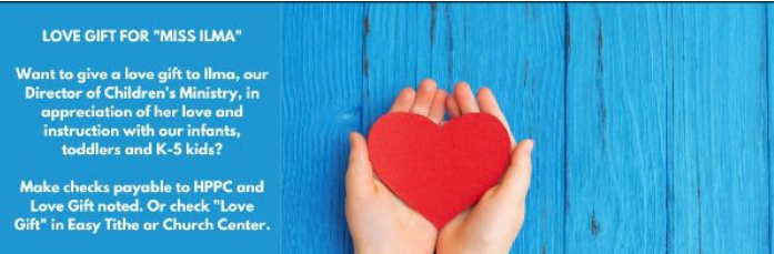 Want to give a love gift to Ilma, our Director of Children’s Ministry, in appreciation of her love and instruction with our infants, toddlers and K-5 kids?
