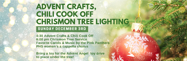 Comments Off on November 30, 2023 – NewsletterEVENTS & FELLOWSHIP Sunday Afternoon, December 3rd @ 4:30 pm Get in the holiday spirit with 3 adorable Advent Crafts, a Chili Cook Off and a Chrismon Tree Lighting Service. Enjoy favorite carols and music by the Pink Panthers Plant High School Women’s a cappella chorus. Bring a toy for the Advent
